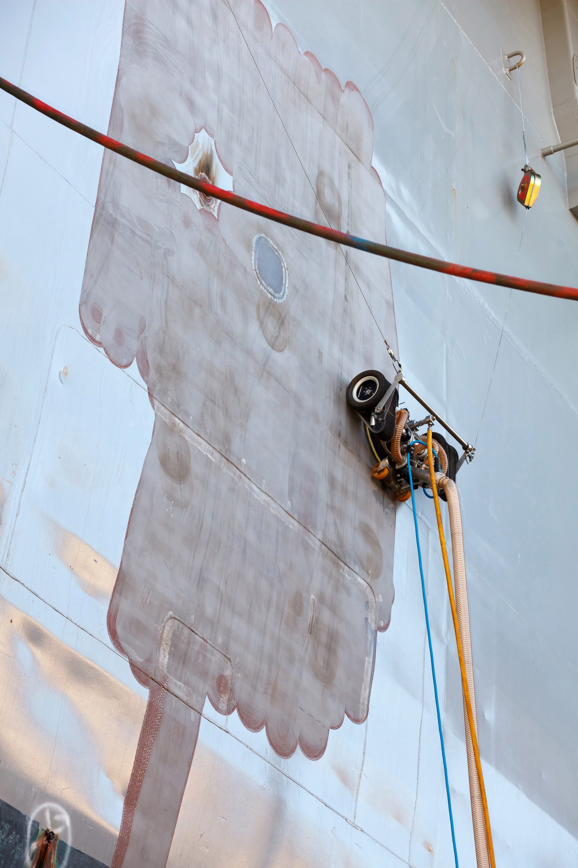 Pridržavajući se vaakumsko-magnetnim poljem za oplatu broda 'USS Mount Whitney' robot Spiderjet odstranjuje staru boju s ponosa Šeste flote Američke ratne mornarice koji je od prosinca prošle godine već četvrti put na modernizaciji u riječkom škveru. Za skidanje boje robot primjenjuje vodu pod visokim tlakom, koristeći inovativnu i ekološki čistu tehnologiju - Ultra High Pressure Water Jet. Upotrebljena voda se, zajedno s nečistoćom, cijevima odvodi u spremnike u kojima se filtrira za ponovnu upotrebu dok se odstranjene čestice boje i hrđe sakupljaju u posebnom kontejneru. Za osam sati rada Spiderjet obradi 400 kvadratnih metara brodske površine, što odgovara radu 10 radnika.
