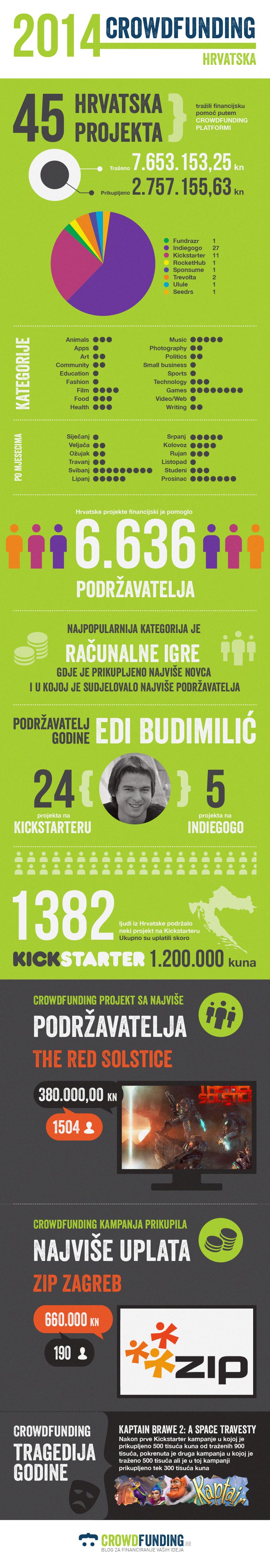 Projekt koji je obilježio godinu je računalna video igra The Red Solstice koja je prikupila 380.000kn sa najviše podržavatelja, njih čak 1504. Zagrebački inkubator poduzetništva (ZIP zagreb) imao prvu i za sada jedinu domaću investicijsku (za vlasničke udjele) kampanju u kojoj je prikupljeno najviše novca, preko 660.000kn. Najambiciozniji projekt protekle godine je S3TR urbano električno vozilo za koje je traženo skoro 2 milijuna kuna, a u kojem je prikupljeno tek 16 tisuća.