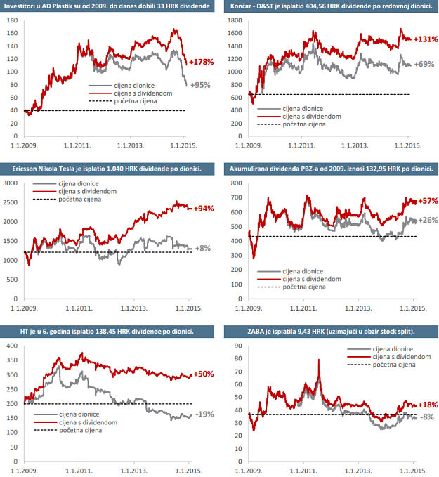 Na grafovima su prikazane po dvije linije pri čemu obje prikazuju vrijednosti od početka 2009. do danas. Prva se odnosi samo na cijenu dionica, dok druga prikazuje cijenu na koju je pribrojena dividenda. Pri izračunu nije uzeta u obzir mogućnost reinvestiranja dividende.