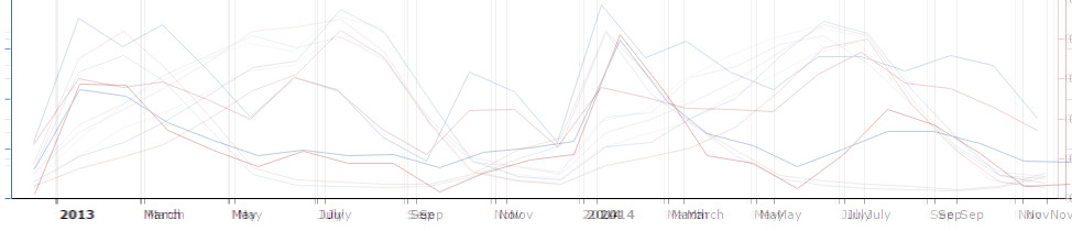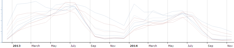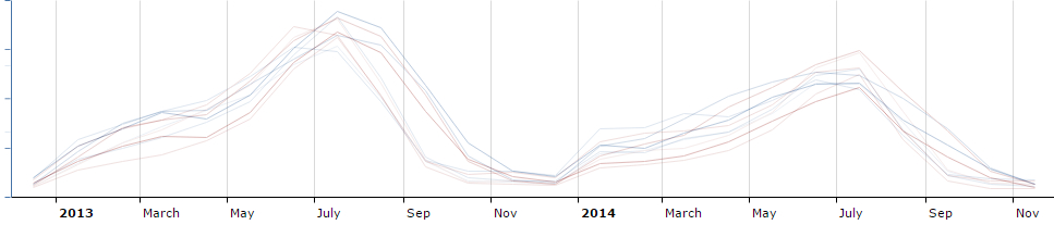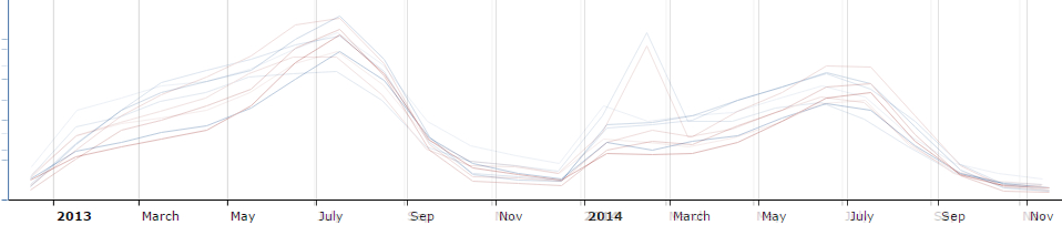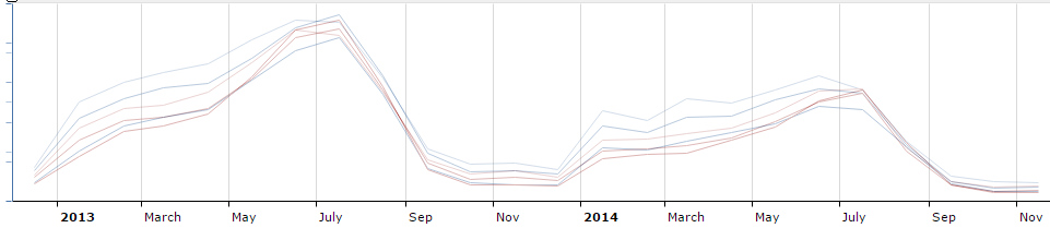 Krenimo prvo da podacima za Grčku i Španjolsku. Na donjoj slici možemo vidjeti usporedbu 2013 godine sa 2014 godinom. Kao što se vidi, dolazi do vidljivog smanjenja pretraga u 2014 godini. Prije svega je to vidljivo u vremenu od svibnja do kraja srpnja.